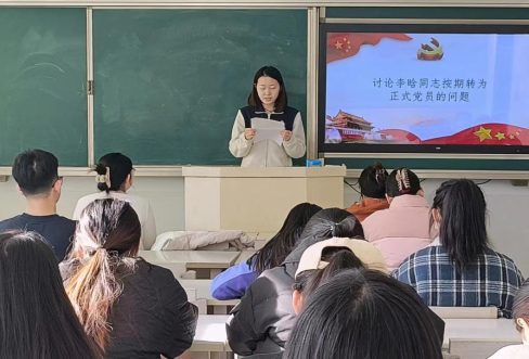 会议开始,彭盈雪同志报告了出席大会的党员人数,宣布了会议的主要流程和具体要求。会议流程严格遵守党员的发展规范,按照预备党员汇报自己在预备期间的有关情况、支部委员会代表向大会报告对预备党员在预备期间教育和考察情况并提出转正意见、与会党员发表意见、无记名投票表决、预备党员作表态性意见的流程依次进行。