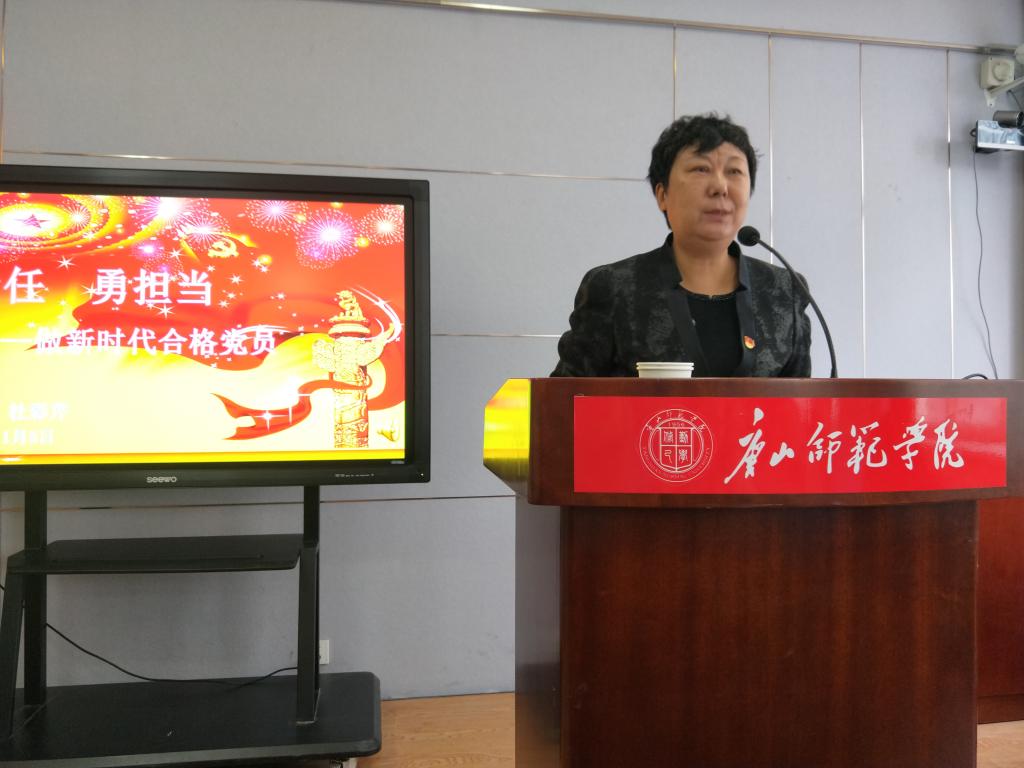 杜彩芹经理分别从员工和教师的角度,带领大家理解了什么是“责任”和“担当”,同时对党员同志们提出四点期望:一要心怀理想,让青春在追求中闪光。不管是员工还是教师,都要树立远大理想,做好人生规划。有理想、有思路、有干劲,脚踏实地去奋斗,才能有战果。二要心存感恩,让心灵在奋斗中成长。要感恩时代、感恩党、感恩父母、感恩公司、感恩社会,感恩所有帮助过自己的人。三要健康阳光,让生命在磨砺中有韧性。要有健康的体魄和健康的心理,做一个积极向上、传播正能量的人。四要奉献担当,让党员形象在“我”身上得到彰显。员工要好好学习,在实践中磨炼、提升自己;教师要立足于本职工作,在平凡的岗位上铸就不同的人生,创造不同的价值。最后,杜经理指出,每个人的力量是渺小的,但每个人都是一条小溪,终将汇入大海,在实现中华民族伟大复兴的道路上,我们都有一份责任和担当。杜经理号召大家勤奋多思,勇于实践;率先垂范,心怀梦想,为实现中华民族伟大复兴做出应有贡献!