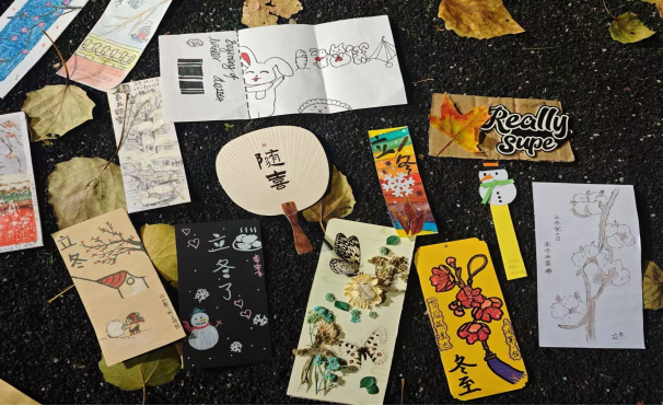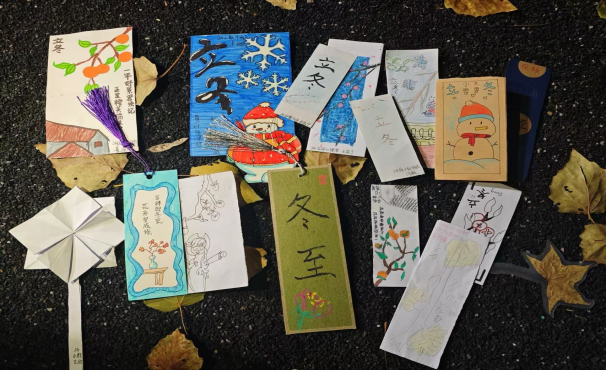 冬季渐近,气温降低,但本次活动以温暖为主线,通过让同学们制作书签的形式来传达自己对亲朋好友的深厚情谊,来为冬日增添一抹温暖。制作书签的材料没有要求,于是同学们有的收集秋天的最后一片枫叶,有的使用卡纸折出自己想要的书签样子,还有同学使用雪糕棍。他们发挥自己的想象,做出的书签设计独特、制作精良。每张书签上都印有温暖的冬至寄语或是对亲朋好友的深深祝福。