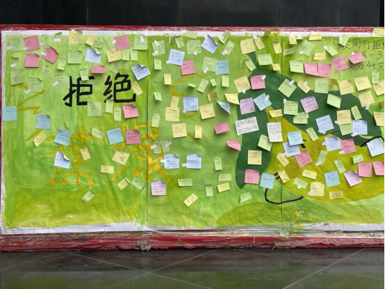 活动当日,各位同学先有序进行签到,再拿出准备好的便签和笔,将自己的烦恼、忧愁,还有愿望、期盼等写在便签上并贴在展板上,代表希望的绿色展板瞬间变成了同学们倾诉解压的粘贴板。这样同学们不仅能表达自己的烦恼与困扰,也能够为其他同学提出自己的疏导方法。