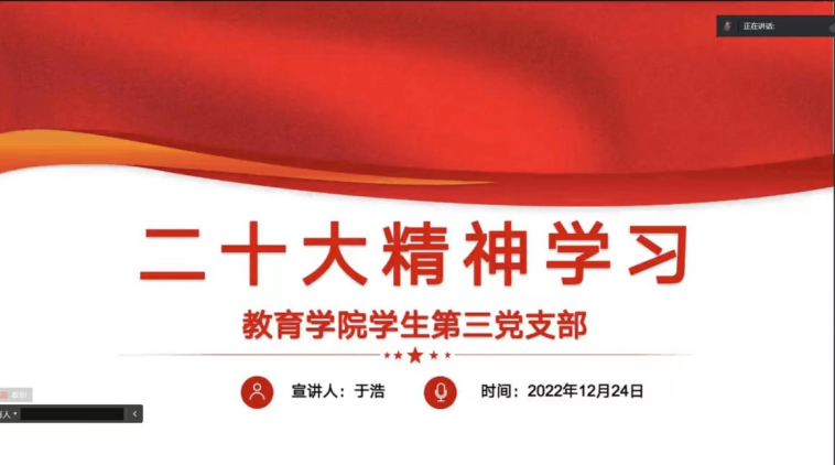 2022年12月24日,tyc122ccVIP员工第三党支部组织全体党员、积极分子通过在线方式重温党的二十大有关内容,学习党的二十大精神。第三支部书记于浩同志向大家强调了党的二十大的重要性,并且从两个方面带领大家学习党的二十大精神。