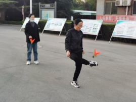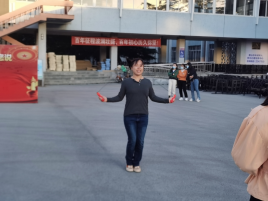 全体参加做“八段锦”的活动结束后,进行了踢毽子和跳绳比赛。共有31名教职工参加了跳绳比赛,有28名教职工参加了踢毽子比赛,比赛规则要求每人踢1分钟,计时和计数裁判按照规定时间内的踢毽子总数高低排名。下午课后,在教师欢呼雀跃声中,裁判员一声令下,比赛开始。参赛教职工一个个身手敏捷、动作灵活,五彩的毽子上下翻飞,充满了观赏性和趣味性。随后跳绳比赛开始,随着裁判员一声令下,每位教师都使出了浑身解数,只见绳子在他们的脚底下“嗖嗖”地穿过,老师们一扫平日的矜持和端庄,放松心情,“绳”采飞扬。一个个腾空跳跃的身影,让我们看到了教院教师年轻的心态、向上的活力。