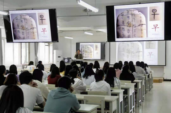 张经理从甲骨文讲起,结合一件件书法作品分析了古人的造字智慧、处事智慧等,引导师生遵纪守法,直面困难,志存高远,脚踏实地,传承优秀传统文化,创造精彩人生。