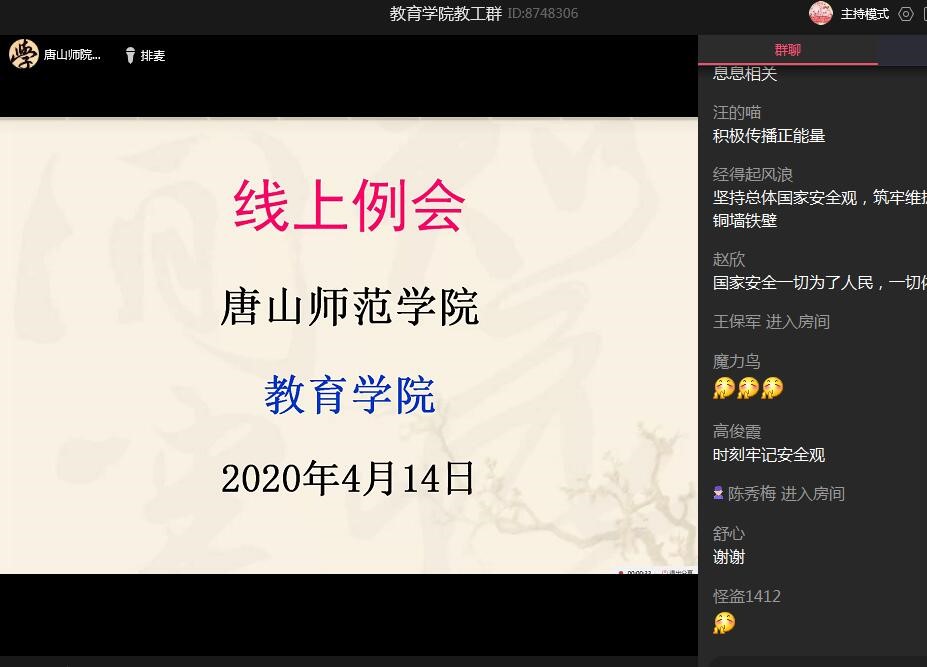 2020年4月14日下午,tyc122ccVIP利用QQ群召开系会。教育公司党委书记陈克良、经理张学鹏、副书记李晓萍、副经理王建国和全体教职工参加会议。会议由经理张学鹏主持。