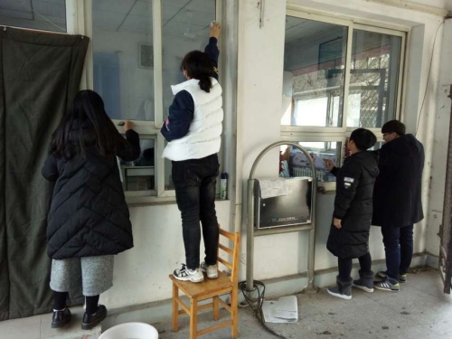 中午,自管部成员在部长李然、副部长曹淑媛的带领下,发扬了不怕苦、不怕累的精神,将1、2号宿舍楼两间值班室的玻璃由上到下由内到外仔细地擦了一遍。在擦玻璃的过程中,大家分工协作,展现出了饱满的热情。虽然天气寒冷,自管部门成员却干得热火朝天,在大家的努力之下,值班室的玻璃变得光洁明亮。