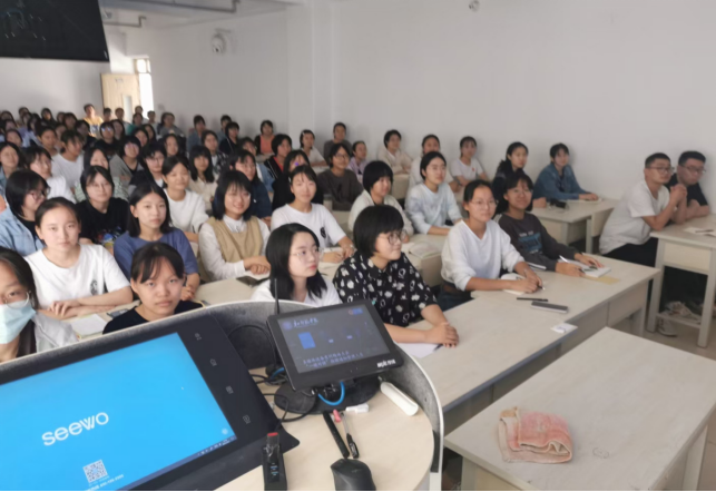 张经理首先普及了字体、工具、临摹方法等书法学习常识,然后以“静以修身,俭以养德”为主题进行讲解,结合多媒体课件,深入浅出地阐释了文字来源、书写技法、文化内涵,幽默的语言,生动的讲解,精准的示范,使同学们受益匪浅。尤其是渗透在书法中的传统文化,让同学们大开眼界,同时产生深深的文化认同感和自豪感。