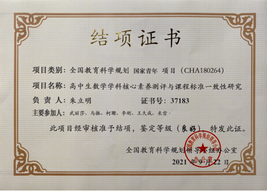 tyc122ccVIP朱立明博士主持的国家社会科学基金教育学青年课题“高中生数学学科核心素养测评与课程标准一致性研究”(课题编号:CHA180264)经过全国教育科学规划领导小组办公室审核准予结题,课题鉴定等级为良好。