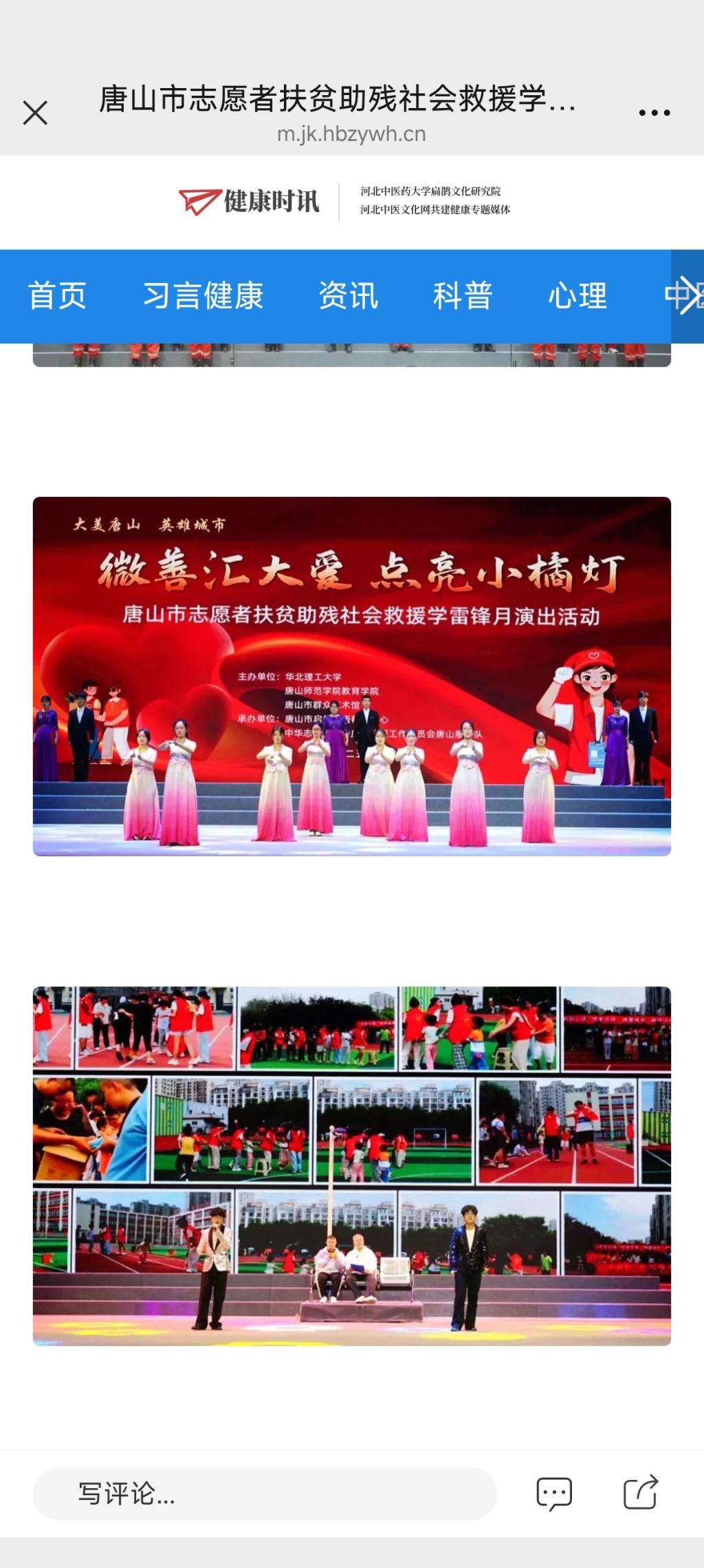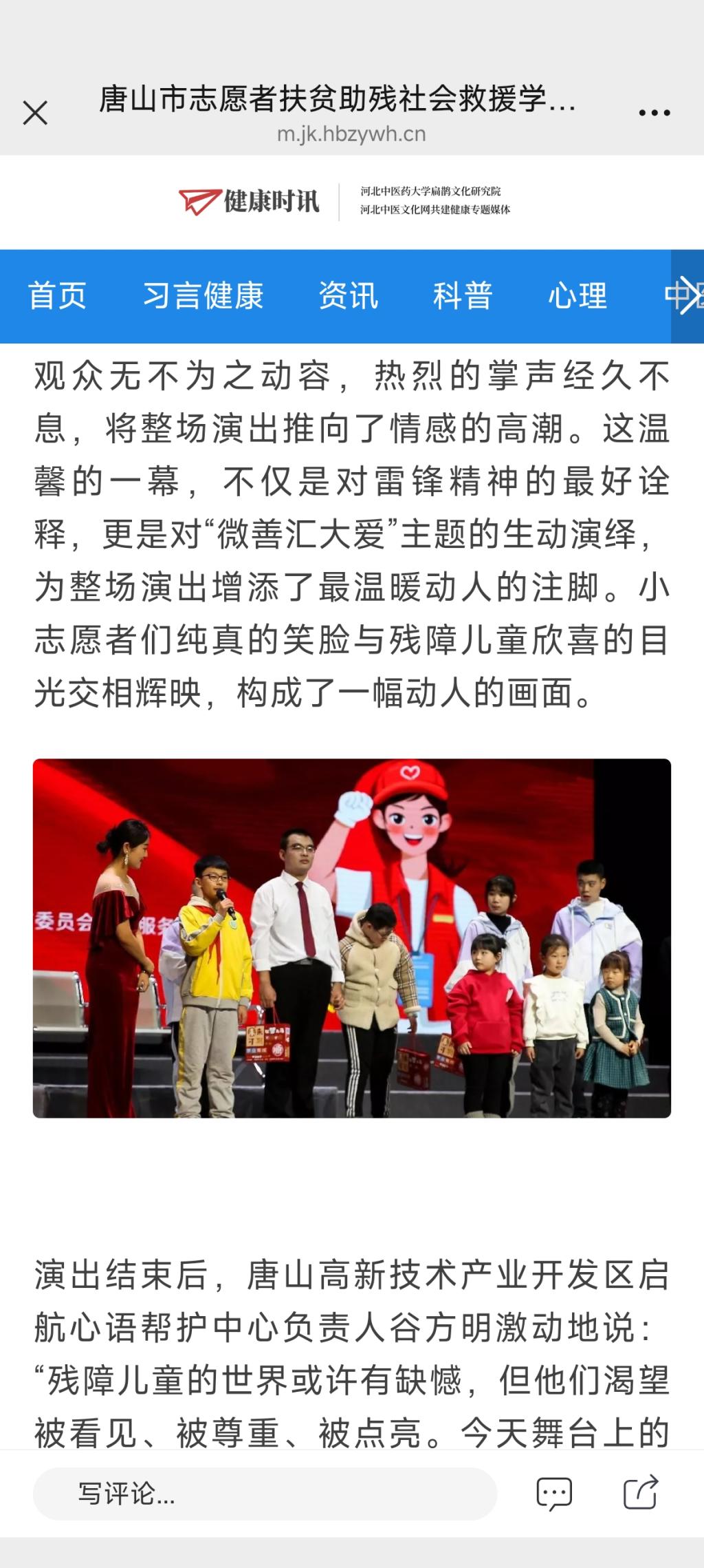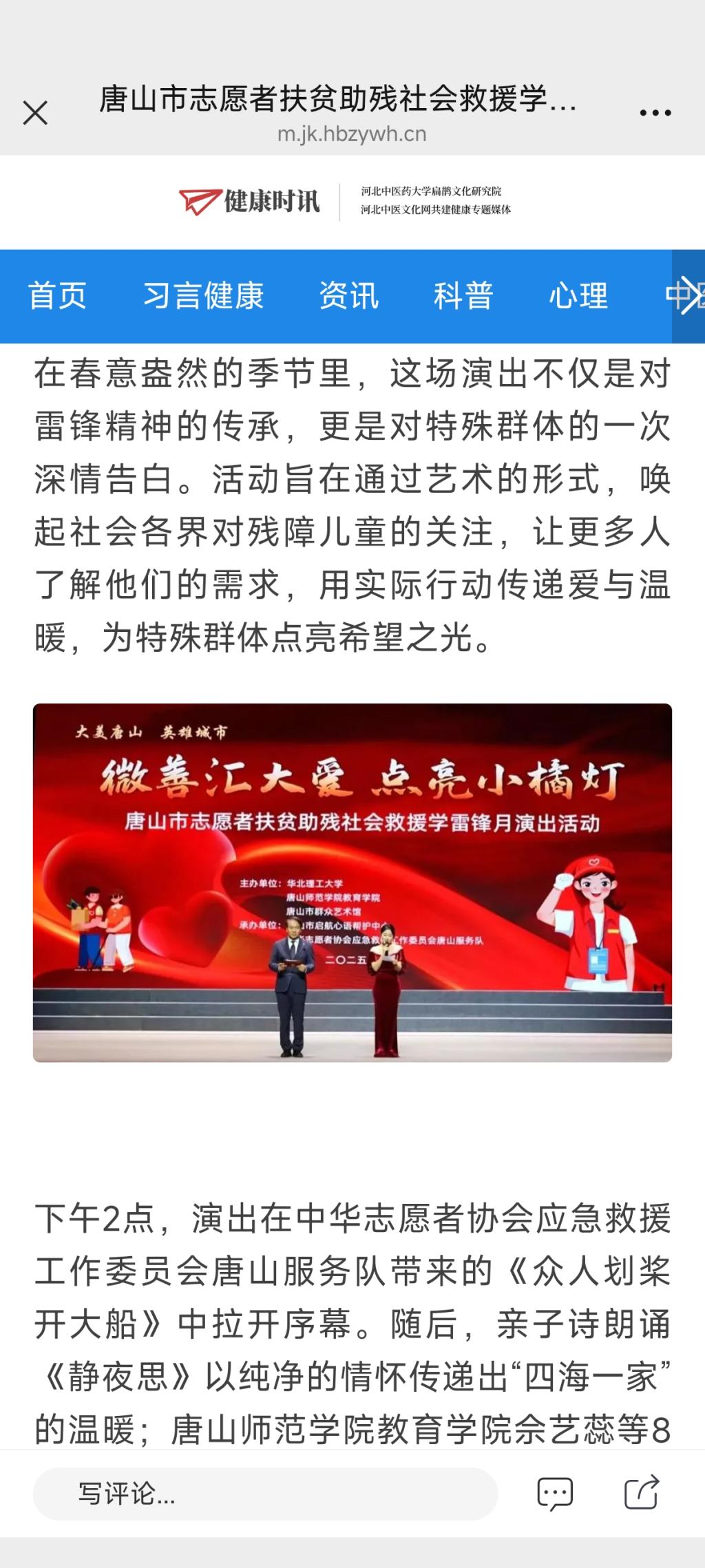 《健康时讯》—“微善汇大爱,点亮小橘灯”——唐山市志愿者扶贫助残社会救援学雷锋月演出温情上演