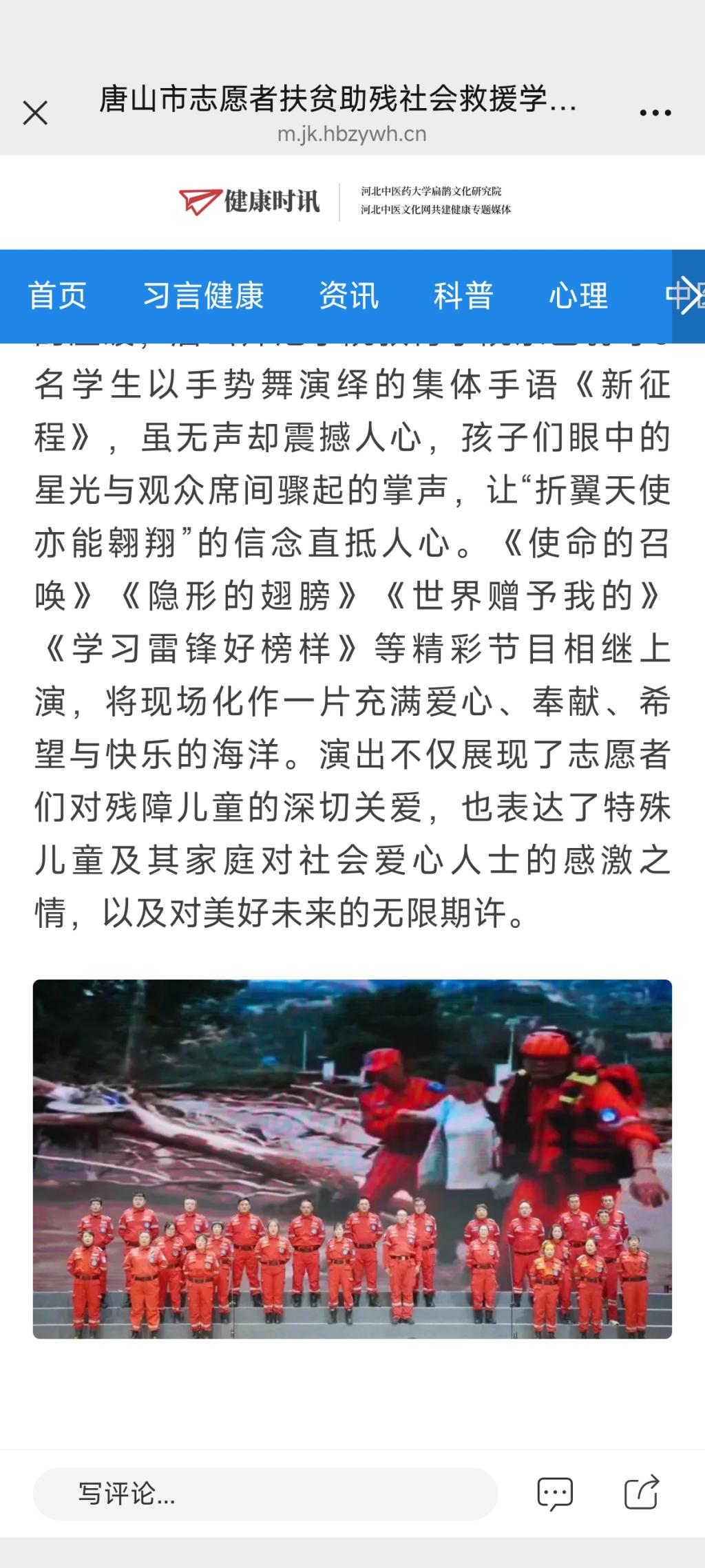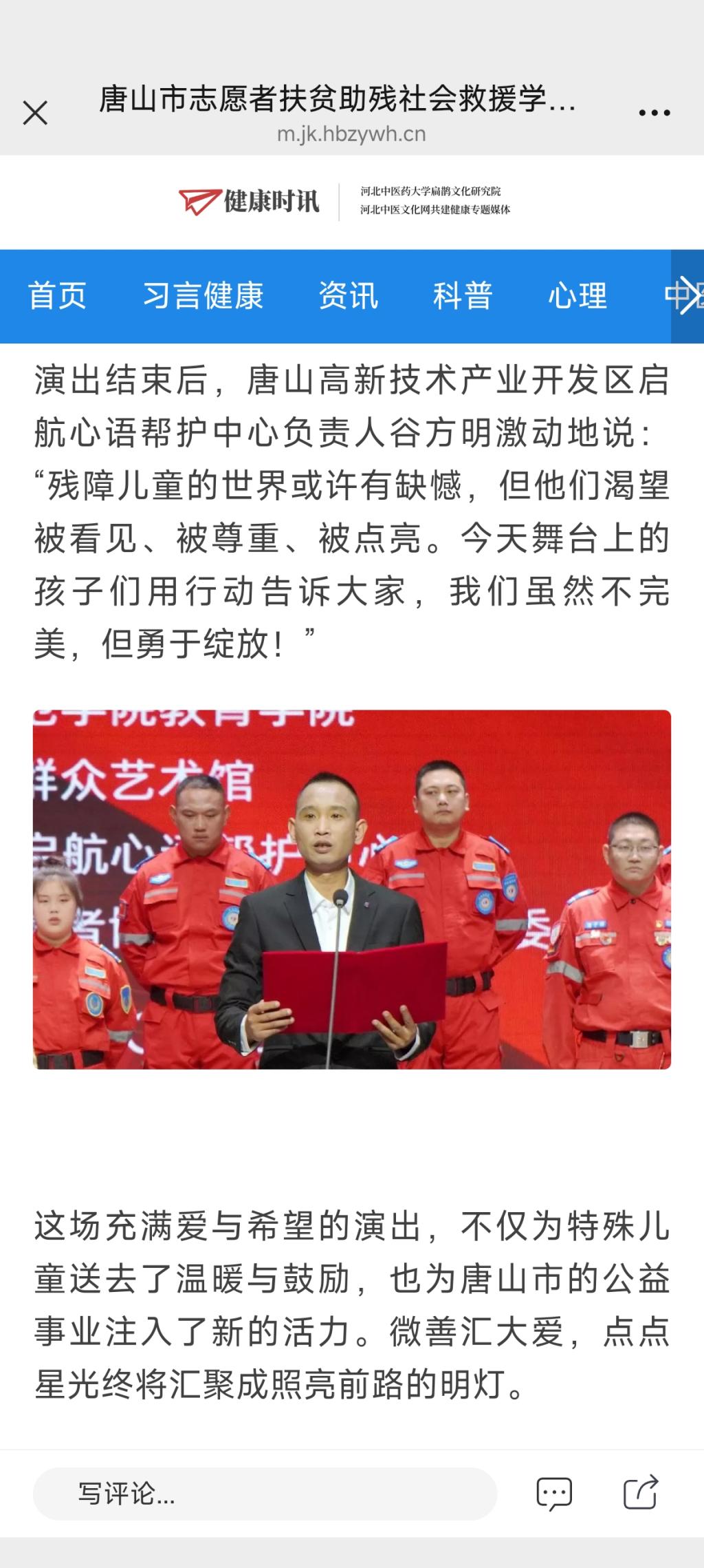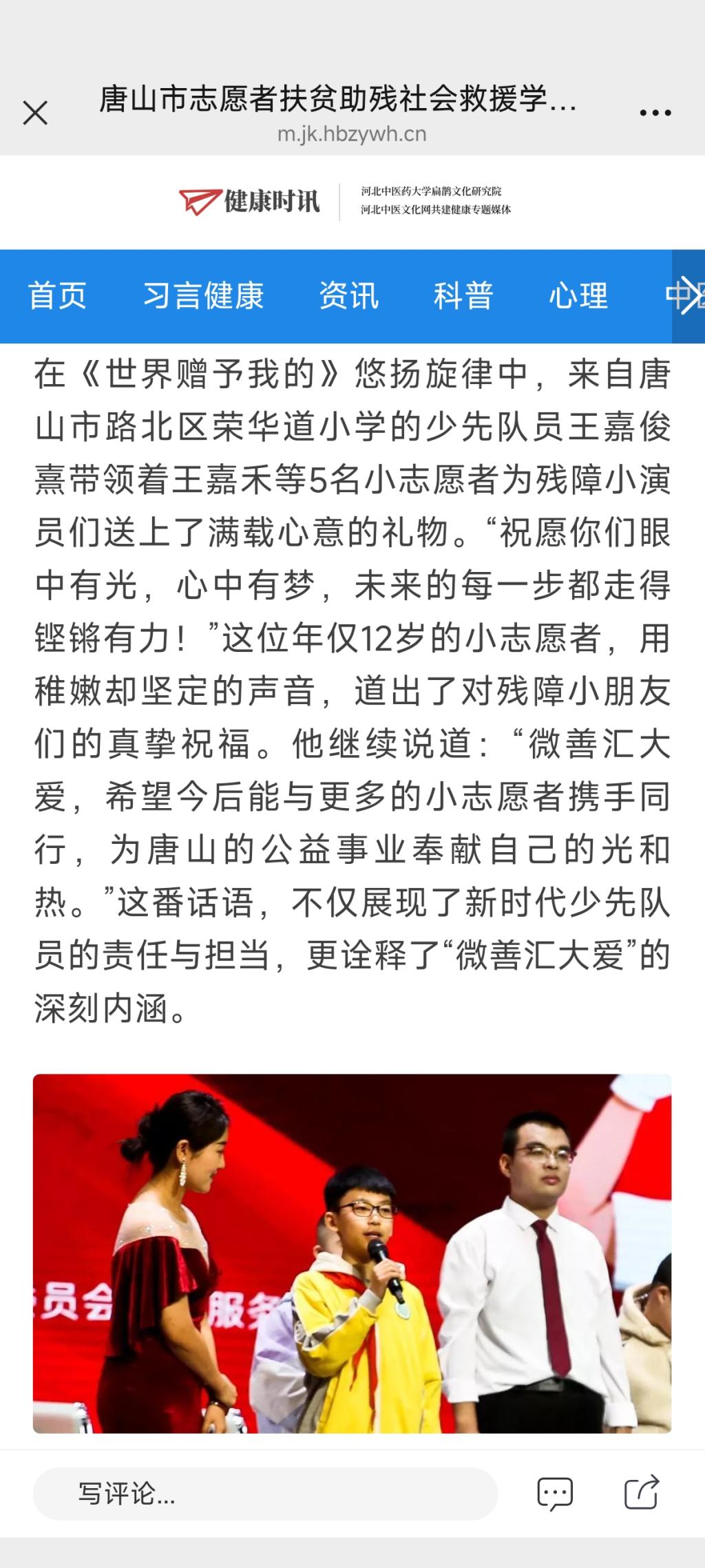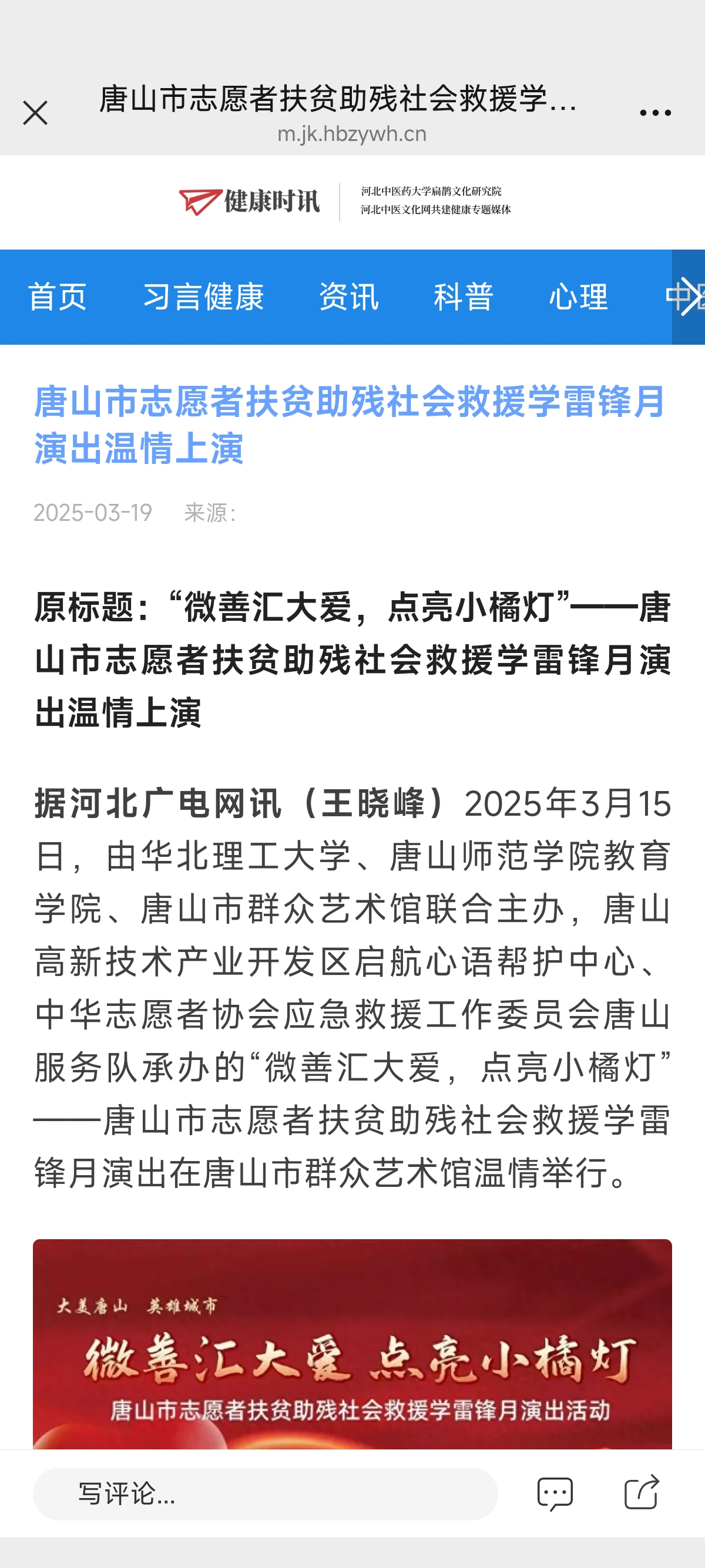 《健康时讯》—“微善汇大爱,点亮小橘灯”——唐山市志愿者扶贫助残社会救援学雷锋月演出温情上演