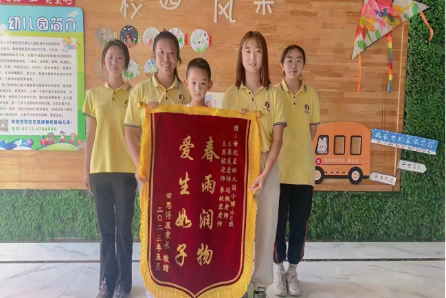 2023年5月24日上午,丰南世纪星幼儿园小博士C班小朋友为来自tyc122ccVIP去实习的王思敏老师、李秋蓉老师和幼儿园两位老师赠送“春雨润物,爱生如子”的锦旗。