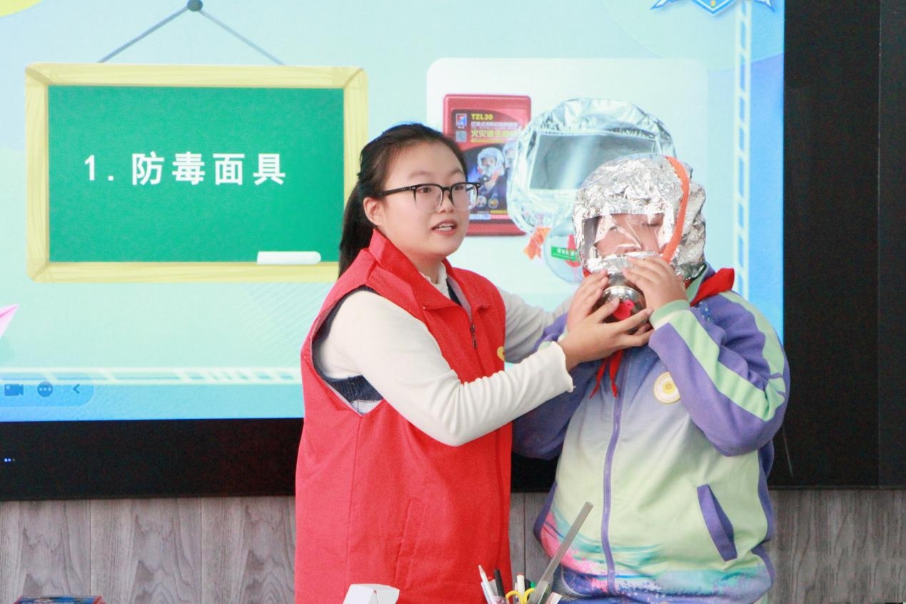 (在路北区唐城壹零壹实验小学,宣讲团成员指导员工如何正确使用防毒面具)