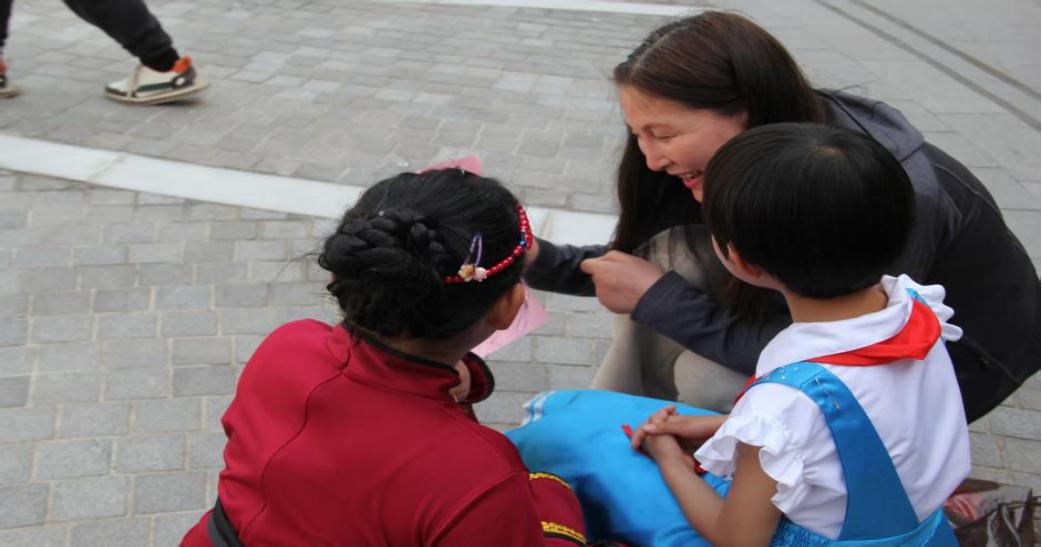 因为今天的天气比较炎热,志愿者带队老师隋春玲在嘱咐志愿者活动注意事项时,突然发现一位家长生气地把一个小女孩从座位上拉起,走到一边大声地训斥,小女孩满眼泪水,手里拿着矿泉水瓶挥舞,用含混不清的语言表达着自己的情绪和不满,隋老师赶紧上前,先安抚家长,而后蹲下身来,轻轻擦拭孩子脸上的泪珠,边擦拭边温柔地对小女孩说:“哭就不漂亮了,还会把化好的妆给哭花了,这样上台表演就不好看了。”随后为了平复孩子的情绪,转移她的注意力,隋老师把她带到另一个在场外坐着休息的小女孩身边,问她们各自表演的节目是什么,排在第几,孩子们虽然识字不多,当知道自己表演的节目排在第几的时候,她们非常认真地看着节目单,一脸的认真和自豪。隋老师温柔的样子,被摄影师记录下来。