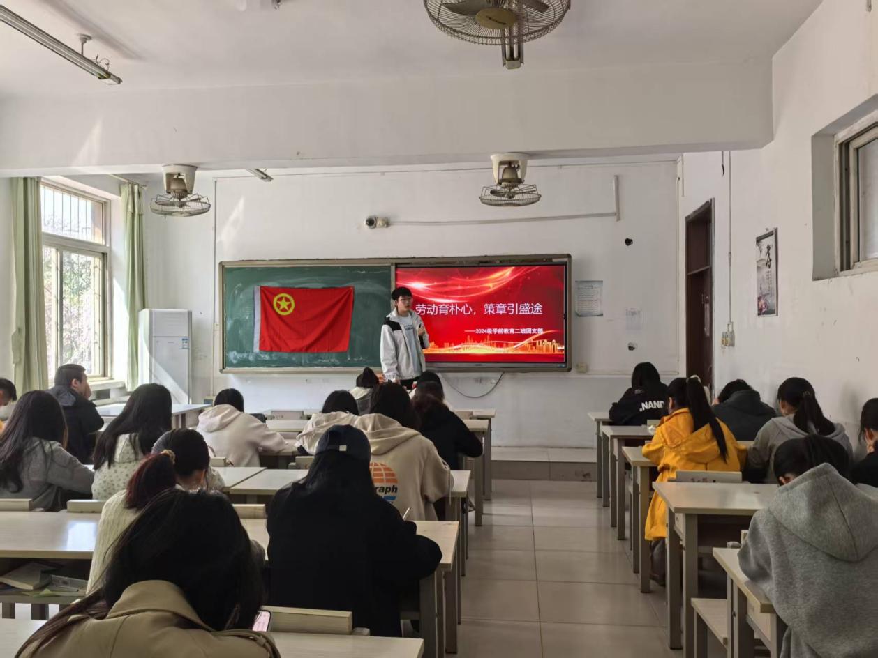 随后,各团支部积极响应,将劳动教育融入各类特色活动。2024级学前教育二班团支部举办“科普劳动知识,点亮成长之光”主题班会。会议以知识讲座的形式展开,团支书首先介绍了劳动的起源、发展历程,让同学们了解劳动在人类社会进步中的关键作用。接着,通过观看视频的方式,讲解现代社会中劳动的多样性,涵盖新兴职业中的劳动技能需求。同学们积极提问,就如何将复杂的劳动知识以简单易懂的方式传授给幼儿展开讨论,有人提议制作生动有趣的动画短片,有人计划编写劳动知识绘本。