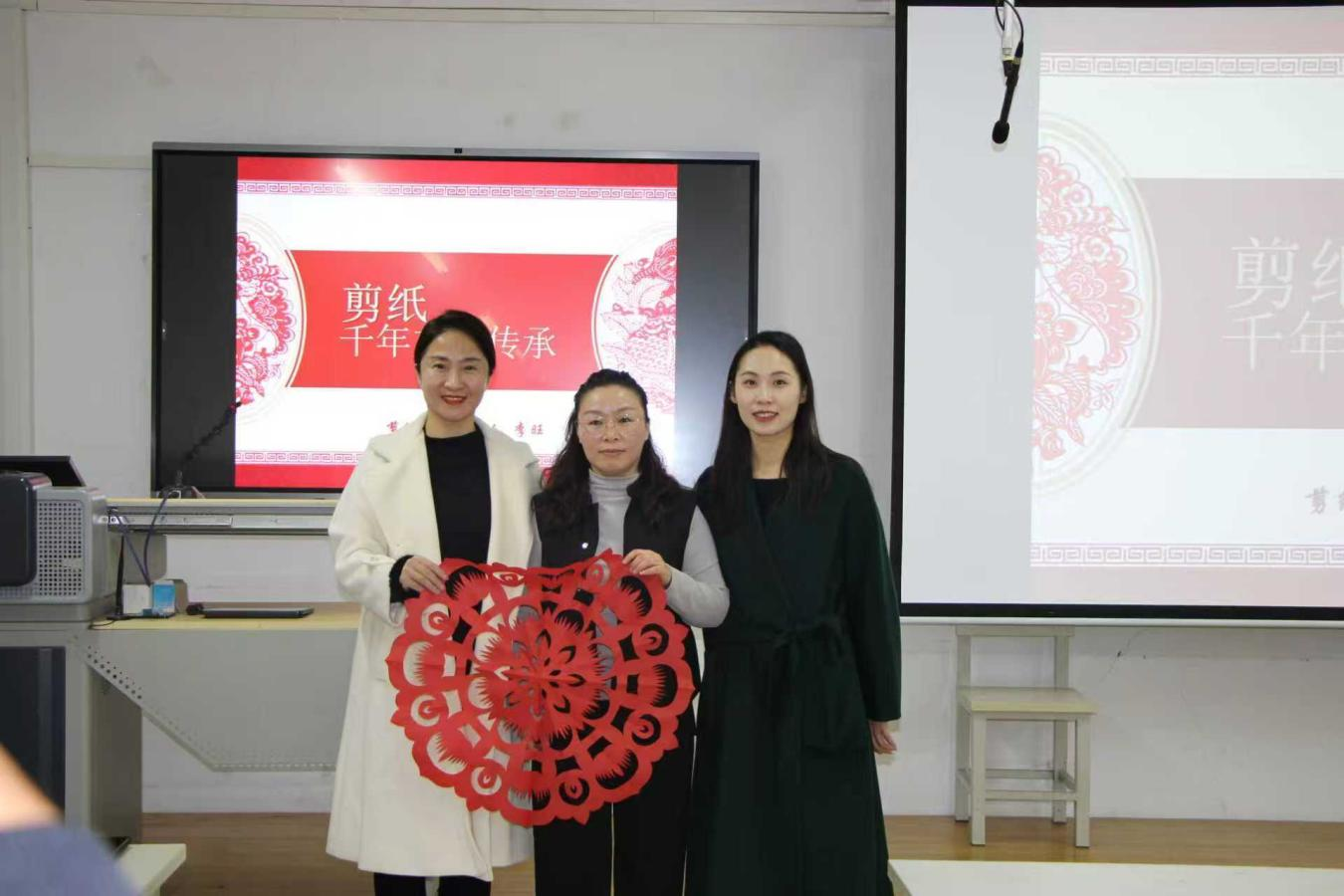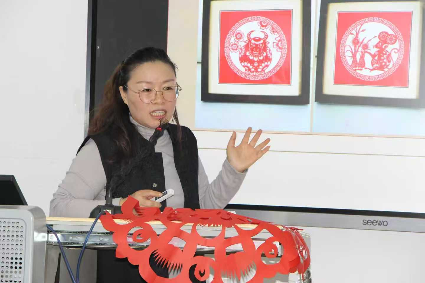 结合自身多年的传承与教学经验,李旺老师重点分享了唐山地域剪纸的特色:“咱们唐山剪纸既有北方剪纸的粗犷大气,又带着冀东民俗的细腻灵动——比如‘喜花’里的‘鱼戏莲’纹样,既藏着‘年年有余’的吉祥寓意,也体现了本地的农耕文化底色。”她现场展示了多幅唐山传统剪纸作品,从婚俗剪纸的“龙凤呈祥”到节庆剪纸的“福字团花”,每一件作品的纹样、配色都对应着独特的文化语境,让师生们读懂了“剪纸是纸上的民俗诗”。